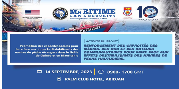 Abidjan, Côte d’Ivoire, September 14, 2023 – In an effort to address the destabilizing impacts of foreign-owned Distant Water Fishing Vessels (DWFVs) in the Gulf of Guinea, a capacity-building and training workshop was held today in Abidjan, Côte d’Ivoire. This crucial initiative, part of the ongoing project titled “Promoting Local Capacity to Address the Destabilizing Impacts of Foreign Fishing Vessels in the Gulf of Guinea and Mauritania,” aimed to equip participants, including reporters, journalists, civil society organizations (CSOs), and community actors, with the skills necessary to monitor and report the negative effects of DWFVs on the Ivorian fishing industry.